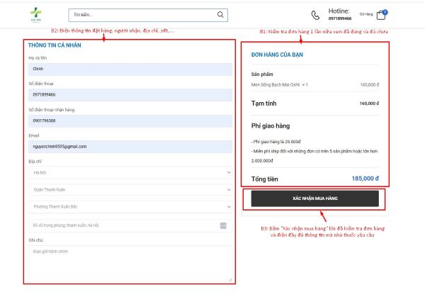 - Điền đầy đủ thông tin yêu cầu như họ tên, số điện thoại, email, địa chỉ nhận hàng, ghi chú (nếu có).