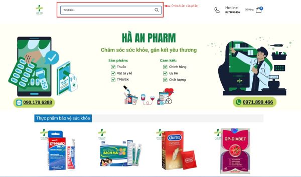Sử dụng ô tìm kiếm trên website để nhập tên sản phẩm cần mua.